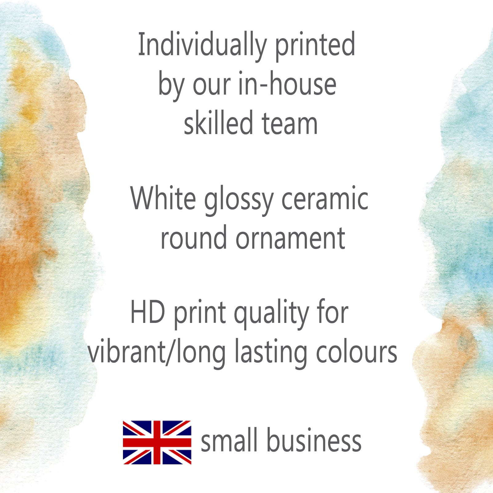 Individually Printed in Milton Keynes, UK: Each ornament is individually printed to the highest standards of colour and quality by our in-house skilled team in Milton Keynes, UK, ensuring exceptional attention to detail.